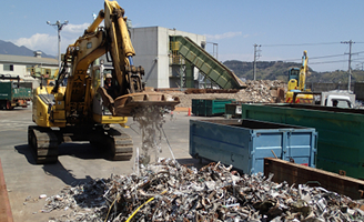 受け入れた物品を重機・手作業にて一次選別します。